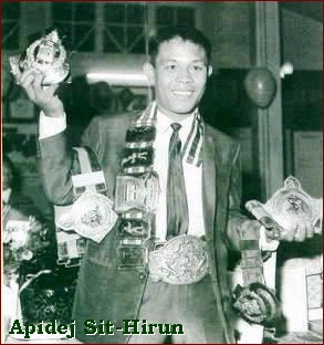 The name Apidej Sit-Hirun captured the boxing fans' imagination when he impressively kicked his way to victory in the bout against Danchai Yontrakit who was down in the third round. Several other well-known boxers lined up to meet him, in order to be defeated, one after another. He outscored the famous Adul Srisothorn and his kicks almost ruined Sompong Charoenmuang's boxing career by breaking his arms.