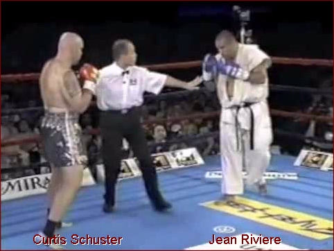 Schuster had just went through a round and a half war with Jean-Claude Leuyer before knocking out Leuyer in the middle of the second round. Schuster hurt his leg in the bout and when called to the ring to meet Roufus, Schuster didn't even have his gloves on. This would have been a great fight! It's too bad for both fighters that it had to end this way. Bad of course for Schuster and surly, Roufus wasn't proud of taking this kind of a win as well.