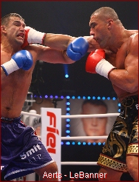 But Aerts picked up his pace in the third, and connected with middle kicks in the early going. LeBanner threw some kicks of his own, but half-heartedly -- as he clearly was more comfortable with his fists. The highlight of the round occurred when both fighters connected at the same instant with right hooks -- and LeBanner's mouthpiece went flying. Aerts won the third on all cards, but judges saw the fight too close to call, and so a tiebreaker round was prescribed.