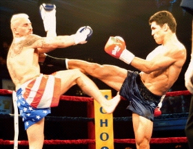 Menor (See photo at right) has made quite a turnaround from a few years ago. With elbows being legal in this bout (Legal in Nevada) Menor split open the left side of Sriyapai's head in round 1, but it didn't stop him. Sriyapai who proved to be strong as well lasted the round. In round 2, Menor knocked him down forcing referee Tony Weeks to administer a standing 8 count. Round 3 was Menor's strongest of them all scoring on many different techniques. In round 4, we had another "Phantom" call by a referee as Duke Roufus fell victim to in the May K-1. After fending off a few punches, referee Tony Weeks stepped in between the two fighters and gave Sriyapai an 8 count. This was a terrible call be Weeks since Sriyapai was in no danger at all and was answering back on everything Menor threw at him. The end finally came for Sriyapai after Menor threw 2 knees at him, which he blocked with his arms, however referee Weeks elected to stop the bout at this time which we thought was an early stop of any pro bout. Sriyapai's only chance in this bout near the end was a knockout since at the stop, Menor was way ahead on points, 40-36.5, 40-34.5 and 40-34.