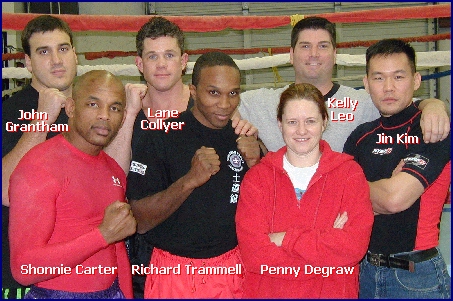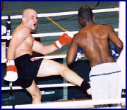 November 30th, 2002 Monterey, Calif. Riot at the Hyatt: This last year former IKF USA National Amateur MuayThai Super Heavyweight Champion, (2001) Carter Williams (Pictured in red, white and blue trunks) moved to the pro ranks of Kickboxing. Since there, he's only had 1 loss. A questionable 2 knockdown decision rule at a K-1 qualifier in Milwaukee, Wisconsin. Williams, like many kickboxers found it hard getting fights so he and his trainer Gene Fields of Modesto, CA decided to start doing some Pro Boxing as well, and with it, he's found more success. This last weekend, Williams won his second PRO boxing fight. He dominated opponent James Monroe (Being punched by Williams in both pictures) of Los Angeles over 4 rounds to earn a unanimous decision at the Hyatt Regency Hotel in Monterey, CA, USA. A sell out crowd of over 1,500 people saw the 22 year old fighter earn his second professional victory. Many know that Williams is a very accomplished kickboxer but have commented, making the transition to boxing would be difficult. With Monroe possessing much more amateur and professional boxing experience, this was a big test for Williams who proved once again, don't underestimate him for a minute! Williams stated "If it wasn't for my