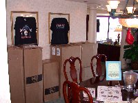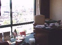 Well everyone, sorry we didn't report in yesterday, there was a little thing called sleep we had to catch up on before presenting this opening story from IKF Homebase here at the Radisson Hotel in Davenport Iowa for this weekends 2002 IKF USA National Amateur Kickboxing Championships. The trip took a bit longer than I wanted it to but after driving over 1,800 miles, here we are at the Radisson Hotel for this weekends 2002 USA Nationals. All that's missing is YOU, the fighters and your trainers, coaches, our event officials and fight fans. Bring It ON! The trip took about 30 hours which included 5 or 6 stops for gas, a few stops for snacks and event supplies I needed to pick up along the way and a stop in Omaha Nebraska to have lunch with our good friend Brooks Mason. I try to live by that saying "Don't ask of others what your not willing to do for yourself," which as some of you know, gets me in trouble sometimes when I don't delegate enough responsibilities to others willing to do so (Last years Nationals for example...) so as promised, I drove the marathon trip here once again knowing that maybe someday, someone else will be willing to do it instead so I can sit comfortably on a plane like the rest of our IKF Staff. While the others are due to arrive Thursday and Friday, Johnny Davis arrived late last night by plane. Johnny of course was refreshed and ready to roll while I needed a little rest after unloading and carrying the 20 plus boxes to our IKF Radisson Office (Right & Below) filled with Championship Belts, IKF Souvenirs, T-Shirts, Gloves, Shin Pads, Computer Equipment and other event supplies. About 10 trips to the room later, our IKF Radisson Office quickly filled up.
