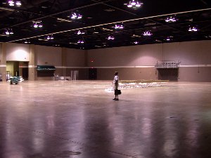 WOW! What will impress you enough will be the opening entree (Right) to the RiverCenter Glass, marble and rock are all you will see, and at night time, this place is even more impressive with all the lighting. But as if that's not enough, the lobby with it's massive hanging USA Flag (Left) to welcome this Great USA Championship event will set you in awe. The lobby alone is nearly the size of the entire venue for last year's event. Still no impressed? Then step into the main event room (Right) Last years venue of just over 8,000 square feet in size is dwarfed by the size of the 36,000 square feet RiverCenter facility. In the picture I took today at the right, Johnny Davis is dwarfed himself by the size of the room. 180 feet wide by 180 feet deep. You could fit over 4 of last years rooms inside this one easily. | ||
