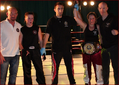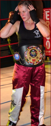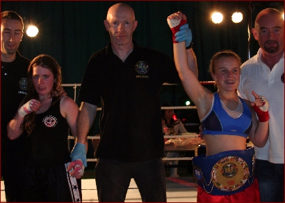 Fighting for the IKF Atomweight Amateur FCR title Kelly Mainwaring and Whitney Huish provided possibly the best female fight held in the UK this year. It was described as 'The Hagler v Hearns for the females'. The two of them just went at it at a tremendous pace. Huish taking a count early in the first round but coming back to push Mainwaring all the way. In the end, after taking some heavy punishment in the 4th round Whitney signalled that she could take no more after taking a tremendous jab halfway through the 5th round. It was a truly great fight.
