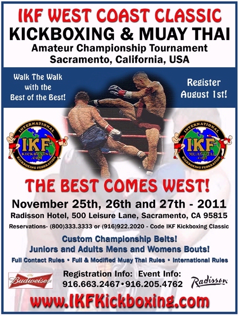 other states like Iowa and Florida. (For info on past IKF Tournaments - CLICK HERE!) The IKF Tournaments has been the proving ground for the best Kickboxers and Muay Thai Fighters in the world in full contact action! Nick-named the "Golden Gloves of Kickboxing Tournament," approximately a dozen countries send fighters, trainers and fans to this exciting affair! The IKF World Classic is well organized with beautiful championship belts and recognized value that will last a lifetime to those with the ability to win a championship. Moreover, the tournament has been an incubator for years for many of today's kickboxing, Muay Thai and mixed martial arts competitors. Now, all of this prestige will come to Sacramento, California in The IKF West Coast Muay Thai / Kickboxing Classic Tournament and continue the legacy of excellence! This historical event has been highly anticipated for the last decade as the West Coast has had some of the most talented kickboxers and promotions in the country over the past twenty years. The Best fighters from around the world will now have the opportunity to match their skills against West Coast elites! The IKF West Coast Classic will be held the weekend of November 25th, 26th and 27th (Friday, Saturday and Sunday) in Sacramento, California at the beautiful Radisson Hotel located at 500 Leisure Lane, Sacramento, CA 95815. Yes, the weekend following Thanksgiving Day. Some may ask, why this weekend? One of the motivators was last year, we witnessed over 2000 + Karate competitors and family members travel to Sacramento one day after Christmas and stay an entire week (Dec. 26th through Jan. 1st) supporting one of the Largest Karate Tournaments (respectfully) in the world called the Super Grands. Clearly, family members, Karate athletes and fans are committed to their sport and annually reserve the date to attend this excellent event. The time is now for the Kickboxing & Muay Thai community to rise up and move the needle on our sport. The IKF West Coast Muay Thai / Kickboxing Championship is the perfect opportunity for you to show your support and passion for the sport you love too! We hope that you will consider the Kickboxing & Muay Thai community as part of your family and come out to this great event! The IKF West Coast Muay Thai / Kickboxing Championship is a must for the serious fighters! Furthermore, the venue is near major shopping areas offering Super Black Friday deals for those that come in early! Its highly recommended that you book your room and flights now! As is with the IKF World Classic, all competitors will need to stay at the host hotel, the Sacramento Radisson. Be sure to use the proper booking code (For Hotel Info Click HERE!) to reserve your rooms in order to receive the discounted entry fee to the tournament. Moreover, staying at the hotel keeps you accessible for all the action for the weekend. The tournament will have four major forms of Kickboxing for men, women and children ages 7 and up. Modified Muay Thai Rules, which consist of kicks and punches of normal kickboxing but adds knees. Full Rules Muay Thai which includes elbows and International Rules which has boxing and all kicks... including kicks to the legs...minus the knees to the body. There will also be the High Kick divisions which only allows kicks above the waist with all boxing techniques included. The first day ( Friday, November 25th) will be registration, weigh-ins, pre fight physical exams, rules meeting etc. for the hundreds of fighters that will attend. The second day (Saturday November 26th) will be the first round of eliminations. Brackets with eight competitors (Brackets will be limited to the first "8" Fighters registered!) will require a second fight on this day for the winners of their first bout. The third day (Sunday, November 27th) also known as Championship Sunday... is where the two finalist in their weight division will fight for the IKF West Coast Muay /Thai Kickboxing Classic Championship. Those fighting for the title in full brackets may have to fight up to three times that weekend to become the champion! All fighters participating in the event will have to be 100% amateur status regardless of their past experience in other contact sports. California Athletic Commission approved inspectors, officials, medical staff including doctors, nurses and full service ambulances will be at the event in case of any emergencies to monitor all competitors before, during and after each match. The limited eight competitor brackets may fill up fast in your division and why it is highly suggested that you enter the tournament as soon as possible. You will be able to see all competitors in your division as the event nears. If no one enters your division, you will have the option to compete in other divisions.