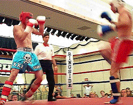 Every competitor has a compelling story, Sgt. Ricardo Sanders and the Marine Kickboxing Team, driving half way across the United States to compete, the magnificent Sunshine Fettkether, with her thunderous leg kicks, trained by Bob Karmel. She is destined for greatness. Trisha Hill, who leveled her opponent with the most spectacular technique of the competition. Duke Roufus with his meticulously prepared MuayThai fighters. How about 14 year old Boomer Fischer, who in her other life is probably your average teenage girl, with make up, girl friends and Britney Spears, but today she is sitting having her hands wrapped, by her fine trainer Benny Voyles, preparing for combat, her hard body evidence of hundreds of hours training in the gym, with a focus that says, I will not be denied, she did win the Championship.