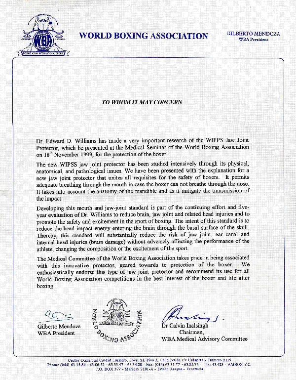 WIPSS Release: WIPSS is proud to release this certificate of endorsement of the Jaw-Joint Protector from the WBA (See Below). The WBA is to be commended for the time and research they have done on this standard for the protection of their athletes. If we can help in making your organization more aware of this new technology of concussion reduction, please feel free to give us a call.
