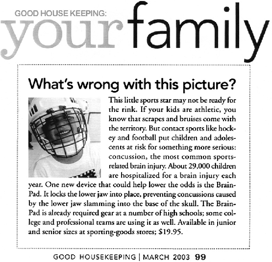 Also in 2002, the Professional Hockey Players Association (PHPA) and the Professional Team Physicians (PTP) added their name to the growing list of organizations to endorse the Brain Pad mouthpiece. The PHPA represent 1450 players in both the American Hockey League (AHL) and East Coast Hockey League (ECHL). The PTP is an organization comprised of the majority of team physicians employed by the 300 plus professional sports teams in North America. The PTP is a leading voice in sports medicine, injury prevention & rehabilitation and defined sports exercise programs. You will find more information online about the Brain Pad at www.brainpads.com, or contact them at (610) 397.0893.