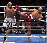 "The Beast" threw some nice low kicks, and when a fatigued Akebono relaxed his guard, got a solid left punch through that stunned the Sumo wrestler. It was a right hook that sent Akebono to the canvas for the first down. But to his credit, Akebono struggled to his feet to beat the count.