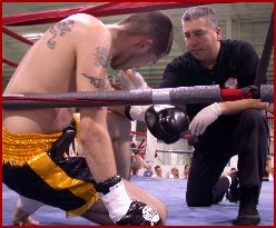 At age 14 Ryan Madigan of Cuyahoga Falls Ohio, USA started karate lessons. At 17 he entered the ring for the first time to compete in his first kickboxing bout. After an impressive amateur career of 18 wins and only 2 loses with 7 wins coming by TKO/KO, Madigan made the move to Pro status. Like many Pro Kickboxers, once there he found the fight offers few, but what opportunities that have come his way, he's made the best of them winning all 3 of his bouts without a loss. Since his phone wasn't ringing off the hook for fight offers, Madigan felt like many pro kickboxers, "If you really want something, sometimes you have to go get it yourself." What he wanted was an IKF Pro Title! So together with his partner Mark Gerberich (With Madigan below right) of Paramount Sports Marketing and his wife Allison (Both at right after Ryan's victory Saturday night) and the Madigan's company, Lion Enterprises, they hosted their first event, FISTS and FEET of FURY. The event was held at the Pinnacle Sports Complex in Akron, Ohio. The complex is a dynamic 70,000 plus square feet indoor soccer stadium. As many first time promotions go the crowd wasn't to capacity but it was full enough to offer plenty of roar for all the bouts. After a full undercard of 9 bouts (See below for reviews and results) of which 2 were exhibitions, it was time for the number 3 Ranked Ryan "The Lion" Madigan show! Madigan's good friend Dan Rawlings had just dismantled well known full contact rules fighter Keith Nesbitt in a single round (See details below) and Madigan was looking to do the same to his opponent, Kevin Hobbs of Phelps, New York. The bout was for the vacant IKF Pro MTR Super Middleweight East Coast Title. Hobbs entered the ring uneventfully (Below Left) with a pro record of 2-1 and an amateur record of 7-3. However when it was time for "The Lion" to enter the ring, he took full advantage of the moment as every fighter in a title match should. The crowd came to their feet as the music started and Madigan took his time as he walked, posed and danced his way with confidence for the hometown crowd to the ring. This kind of showmanship is what we need more in this sport. Once in the ring, the Lion dropped his elaborate fight robe (Another thing all fighters should have.) to unveil a chiselled fighting machine. Once the ring talk by referee Dan Stell was given the bell rang and the action started. Madigan started strong landing several strong kicks to Hobbs' neck. One dropped him (right) and when Hobbs didn't get up quickly (In MuayThai Rules, if a fighter stands quickly after a flash knockdown he isn't given a standing 8 count) referee Dan Stell started his 8 count. Once recovered The Lion went back to work landing several strong combinations as Hobbs failed to answer back with anything of any threat to Madigan. When round 1 came to an end, Referee Dan Stell checked on Hobbs in the corner. After asking him several times, Hobbs came up with the same answer, "No, I can't continue!" As Stell waived his arms to call the bout the hometown crowd went wild as Ryan "The Lion" Madigan became the new IKF Pro MTR Super Middleweight East Coast Champion with a win by TKO! The win puts Madigan in position to strive for yet another level in the MuayThai Super Middleweight division such as a shot at the vacant IKF USA or North American Title. Here's the results of all the nights action below. |