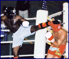 November 30th, 2002 Monterey, Calif. Riot at the Hyatt: This last year former IKF USA National Amateur MuayThai Super Heavyweight Champion, (2001) Carter Williams (Pictured in red, white and blue trunks) moved to the pro ranks of Kickboxing. Since there, he's only had 1 loss. A questionable 2 knockdown decision rule at a K-1 qualifier in Milwaukee, Wisconsin. Williams, like many kickboxers found it hard getting fights so he and his trainer Gene Fields of Modesto, CA decided to start doing some Pro Boxing as well, and with it, he's found more success. This last weekend, Williams won his second PRO boxing fight. He dominated opponent James Monroe (Being punched by Williams in both pictures) of Los Angeles over 4 rounds to earn a unanimous decision at the Hyatt Regency Hotel in Monterey, CA, USA. A sell out crowd of over 1,500 people saw the 22 year old fighter earn his second professional victory. Many know that Williams is a very accomplished kickboxer but have commented, making the transition to boxing would be difficult. With Monroe possessing much more amateur and professional boxing experience, this was a big test for Williams who proved once again, don't underestimate him for a minute! Williams stated "If it wasn't for my