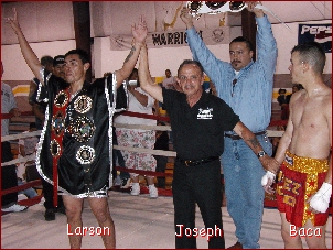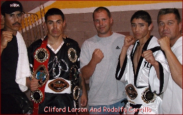 beat the count and made it to the bell. Round goes to Larson.I feel I need to make this comment about Clifford Larson. Larson started his kickboxing career on one of my events and fought on a bunch more. He is a prime example of someone that wanted to be a CHAMPION. After his first 7 fights his record was 0-7 and he got TKO'ed three times. But he did not give up, where most people would have given up. To be honest, I was thinking he should give it up too. I just Love when a fighter proves me wrong and Larson sure did. He found the way to be a Winner in his next 8 fights in a row! Not only did he win the fights he won the IKF Arizona State Title and the IKF National Tournament Title and Now the IKF Southwest Title. I am Very Proud of Clifford Larson. I just wanted to say to Clifford, Thanks for showing me the true meaning of "CHAMPIONS Never Give Up!"