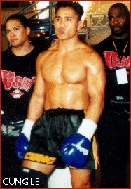 The IKF started sanctioning San Shou on March 20th, 1999 at the Vallejo Fair Grounds in Vallejo, California, USA. The event was promoted by IKF Promoter Tim Stell of Fairfield, California. In the first ever, official IKF San Shou Rules Bout, Shawn Salmons of San Jose, California, USA defeated Alan Kanig of New York, New York, USA by TKO in round 1. In the second IKF San Shou bout Marvin Perry of Boston, Massachusetts, USA defeated Adam Resnick of New York, New York, USA by HEAD Kick KO at :22 seconds of round 2. Next came the Pro San Shou division. The first Pro San Shou bout was an IKF title bout and featured Al Loriaux of Boston, Massachusetts vs Sean Douglas of Toledo, Ohio. In the bout, Douglas attempted a jumping leg scissor takedown and landed wrong on his arm and injuring it. Loriaux was ahead on points at the time of the injury and Douglas could not continue so at the time, Loriaux became the first ever, IKF San Shou Champion winning the IKF San Shou Rules, United States Super Welterweight Title. However, the bout was later ruled a "No Contest". This meant that the first ever IKF San Shou title was still up for grabs and history was still in the making. Enter already, two time National San Shou Champion Rudy Ott. At the time, Ott had a record of 18 wins and only 1 loss and was training out of Boston, Massachusetts. Ott stopped his opponent Cary Nathan of Redwood City, California, USA by KO at 1:45 of the 3rd round to be the first ever IKF San Shou champion winning the IKF Pro San Shou Rules US Super Middleweight Title. Ott didn't stop there. He later moved to San Jose California to train with now IKF San Shou World Champion Cung Le. On December 15th, 2001 in San Jose, California Ott went on to win the IKF Pro San Shou Intercontinental Title when he defeated Peter Kaljevic (Both shown at ABOVE right - After the bout with IKF Referee Dan Stell) who was born in Montenegro, Yugoslavia but lived in New York City, New York, USA. This fight was clearly the "Rudi Ott Show" as he used nearly every throw in the book scoring often as if Kaljevic never knew a counter. In the end Ott won a unanimous decision. On that same event in San Jose, the man who caught the eye of the IKF and sparked the beginning of IKF San Shou, Cung Le, (Left) became the *Second IKF Pro San Shou World champion when he defeated Shoni Carter of Chicago, Illinois, USA by unanimous decision winning every round. (*) "Second" because someone else had an IKF World San Shou title before Le. The Semi Main Event that night lost some of it's hype when IKF MT & IR World Champion Danny Steele of Los Angeles, CA, USA didn't make the weight cut off of 147 lbs. for the vacant IKF San Shou Welterweight World Title. Steele made 149.5 but was unable to drop any more. Because of this his scheduled opponent, Matee Jedeepitak of Ratchaburi, Thailand via Indianapolis, Indiana, USA was awarded the first ever IKF Pro San Shou World Title by forfeit. Still, these two fought anyway in what was "Suppose" to be a San Shou rules bout. However, neither showed they had any San Shou skill at all and the bout played out to be a MuayThai bout with a couple of ugly takedowns. Jedeepitak has never been challenged for the title and has never fought San Shou since. Both Ott and Le have been important parts of IKF San Shou as fighters, trainers and event promoters. They along with others such as Promoters David Ross out of New York and the Stell brothers out of Fairfield have kept IKF San Shou busy. Ott went on to win his own IKF San Shou World title when he won the IKF Pro San Shou Middleweight World title by defeating Dave Marinoble (Both shown at right) of Roseville, California, USA by unanimous decision on August 31st, 2002 at Win-River Casino in Redding, California. The bout was scored 48-47 by 2 judges while the 3rd saw it 49-46. On December 7th, 2003 the IKF spread it's San Shou wings when it sanctioned 3 IKF Pro World Titles in Beijing, China. That night the IKF crowned 3 new San Shou world Champions. Light Welterweight Champion Han Yuzhu Beijing of China when he defeated Fernando Calleros of El Paso, Texas USA by unanimous decision. Super Middleweight Champion Bao Ligao of Beijing, China defeated Dave Marinoble of Roseville, California, USA by unanimous decision and Light Cruiserweight Liu Hailong also of Beijing, China when he defeated Eduardo Fujihira of Brazil by unanimous decision. The last big IKF Pro San Shou World title was for the vacant Super Welterweight division. the bout was on May 1st, 2004 in Brunssum, Holland/Netherlands when Danny Hoyer of Holland defeated Alexis Hountondji of Belgium by KO when Hountondji could not stand by the end of Referee Dan Stell's count of 10 after a strong knee by Hoyer to his body at 1:00 of round 5. The event was promoted by Hoyer's father, Loe Hoyer (Both shown at right) and was the first IKF Sanctioned San Shou event fought on a "Traditional" San Shou fighting platform, not a boxing ring. As for the event itself, Loe Hoyer left noting out. From the impressive dual lion dance opening to the lights, cameras and action, this event had BY FAR the BEST San Shou fighting as a whole we had ever seen. All the fights were fought under San Shou rules and one thing is for sure about European San Shou... These guys ROCKED!