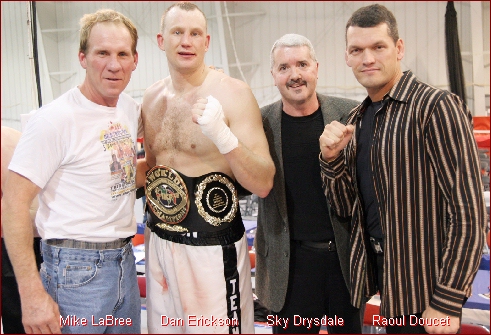 Loves Park, Illinois, USA These 6'6" twin towers were all over the local media that weekend, as all three local networks headlined their Friday night sports reports with this story. Both Erickson and Smiles appeared on the local rock (radio) stations and the news talk stations, talking about their hopes of walking away with the coveted IKF belt. This particular RUMBLE event was honored to have fighters from neighboring Chicago, Minnesota, Wisconsin, Alabama, Tennessee and Europe. It truly was an international event. All fights were fought under the IKF Full Contact Rules. Sitting ringside was the number 1 contender for the vacant IKF Pro FCR Super Heavyweight World Title, Raoul 'The Axeman' Doucet. Raoul was flown in from Montreal to challenge the winner of the Erickson/Smiles fight to step-up in weight and fight him in Drysdale's next event this coming spring for the IKF Pro FCR Super Heavyweight World Crown. In the audience was a host of familiar faces, including current IKF Pro FCR Light Cruiserweight World Champion Mike 'Tension' Nevitt, Troy 'Hollywood' Hughes, Ricky 'The Wolf' Haynes, Gus 'Rotten Rudy' Winterland and Cheap Trick's Rick Nielsen. Former IKF Pro FCR Super Heavyweight World Champion 'Mean' Mike LaBree was glad to be home, as he is one of Dan Erickson's trainers. The local Marine Corp. Recruiting station provided the color guard. Immediately following the intermission, they marched to the ring in formation as B.E. Taylor's version of 'America The Beautiful' played, followed by our country's National Anthem - also performed by B.E. Taylor. After all was said and done, it was one exciting night of kickboxing! Say what you will, but thanks to Pro & Amateur IKF Promoters like Sky Drysdale, Full Contact Rules Kickboxing is still alive and well in the Midwest! The fans love it! The fighters love it! And next spring Drysdale will add a few pounds to his always great event and step-up to see who will become the next IKF Pro FCR Super Heavyweight Champion, when 'The Preacherman' meets 'The Axeman'! |
