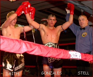 AK Promotions Everyone in the sold out Radisson Ballroom knew there was something big about to happen as Smith and Gonzales entered the ring. The noise made by both teams was deafening! As the bell sounded for the start of round one...there was no feel out game here. They had good back and forth action, landing great kicks and punches to the body and head! Smith was very affective with his front kick to the chest of Gonzales but Gonzales seemed to shrug it off and continued to be the aggressor while finishing his hand combination with hard round kicks to the head of Smith! Smith's solid defense blocked most of them early on! The crowd reacted loudly to each impressive pop of Gonzales' instep and shin as they nearly missed the target and landed hard on the gloves of Smith! Round two and three would be much of the same. Smith landed a hard round kick to the thigh of Gonzales, followed by a strong cross that clearly stunned Gonzales momentarily! Then there was a pause... something looked familiar to this onlooker! It was that same look seen in the Crandle Vs Gonzales match months earlier! In that fight, Gonzales was hurt in the first round and took a standing eight only to come back in the second round to TKO Crandle! Again, Gonzales seemed to be going into another zone! If he were a cat, his eyes would have changed colors as he tilted his chin into his chest and gazed in towards the target like a heat seeking missile! It was like he became "The One" as Keanu Reeves did in the movie The Matrix! Almost everything Smith threw from that point was blocked and, or slipped and then countered with an impressive round kick to the head and body! Seek and destroy became Gonzales' mission as he walked down and sometimes threw down Smith as to say I'm invincible...HEAR ME ROAR! Gonzales then wrapped his hands around the neck of Smith and started a series of knees to the body! The crowd was going wild with excitement as the battle pursued at center stage! One of Gonzales' knees connected hard to the body of Smith and one may have accidentally caught him in the face but for sure the punch or kick that followed put Smith down for an eight count! At the end of the eight count, Smith intentionally spit out his mouth piece to buy more time and was penalized one point by Referee Dan Stell. He was clearly dazed by the assault of kicks and punches from Gonzales! Smith was definitely not willing to quit and was throwing his own brand of outstanding combinations throughout the fight and looked impressive! Some of his techniques were landing clean but Gonzales would not go for it and continued his onslaught! The fourth and final round was here and the audience applauded loudly with approval of this great fight they were witnessing and were happy that they were going to have a chance to see yet another round of great action! It has been said often, 'never slug with a slugger'! As mentioned in a previous article regarding this fight, Gonzales has some of the most talented boxing skills in the amateur ranks of Muay Thai and will always be of great danger to anyone who tries to test him as Nathan did in the fourth round! In the midst of a fury of battle, both men began to land some bombs with kicks and punches and an occasional knee! Then it came... about an eight punch exchange (or should we say "bomb" exchanges) where both men landed some shots but in the end it would be Gonzales' power and accurate jabs, crosses and a huge left hook sent Smith flying into the ropes defenseless and would end the night for Smith! Referee Dan Stell had to jump quickly to put a stop to the punishment before the very dazed Smith was hurt even more! Gonzales look as though he was ready for four more rounds as he was coming in to add the final touches before the stoppage! The crowd came to their feet to show their satisfaction for what they'd witnessed...a great fight between two great fighters! After the fight, Gonzales toured the ballroom with new belt and four foot trophy in hand only to be mobbed by the fans wanting to simply shake the new champ's hand or get a photo op! Its clear they want to see more of Gonzales...sooner rather than later. Sounds like a superstar in the makings! If smiles were worth a million dollars, we would all be rich because the huge smile Gonzales wore on this night was simply - priceless! Nathan Smith must now decide whether he wants to move forward with his plans to turn pro or hang out in the amateurs to see what else is left for him. He is a very talented fighter and will defeat most Welter and Super Welterweights on the planet. However, on this night, he fell a little short but I'm sure we will be seeing more of him in future events! |