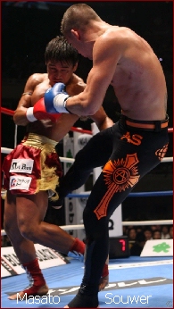 The turning point came late in the round, Souwer smashing in a right straight punch, catching his off-balance opponent with a number of hard low kicks. At the clapper Souwer was chasing the retreating Japanese fighter, and when the bell sounded Masato slowly slumped over the ropes, hurt and exhausted. The ringside camera stayed on Masato between rounds, and the question now was whether he could answer the bell for the third. The time ticked off, the announcer called 'seconds out,' but Masato's cornermen remained huddled round their seated fighter, who had pain tattooed on his face. A quiet, mournful shake of the head and the hint of a smile from Masato. It was over. Souwer leapt in the air, then dropped to the canvas and bowed to Masato, lifting the Japanese fighter to his feet as the crowd rose to theirs to offer both warriors a standing ovation. In his post-fight interview, Masato told reporters that injuries to his hand and legs from his bout against Buakaw had badly limited him in his subsequent fights. Commenting afterward on his strategy for the final, Souwer said, "My trainer Andre Mannaart and I knew Masato wanted to rush me with punches, so we had this plan to use kicks. My ribs and my ankle were hurt in my fight with Kraus, and my right hand was also causing me pain, but I had to give my all against Masato, who is one of the best!" With the victory, Souwer reclaims the Belt he surrendered to Buakaw last year, and also picks up a cool 20 million (not US) in prize money. "My second son was born just last week," said Souwer, "I will put this money in the bank for him and his brother." In the Reserve Fight it was Takayuki Kohiruimaki of Japan vs Virgil Kalakoda of South Africa. Kohiruimaki wanted the distance to throw his kicks, but Kalakoda kept moving inside with the fists. Kohiruimaki had said in the pre-event press conference that he would "find the right position" to defend against Kalakoda's punches. Unfortunately for the fans, the position he choose was the clinch, prohibited under K-1 rules. This got Kohiruimaki numerous warnings and a yellow card. Kalakoda had the much better strikes, several straight punches and a right hook in the second then a left straight in the third for a down. After the count, Kalakoda pounded in tight hooks for another down and the win. In a Superfight, seidokaikan fighter Kazuya Yasuhiro of Japan took on kickboxer Su Hwan Lee of South Korea. Fast and furious this one, the fists seeing action, Yasuhiro getting a right through in the first, Lee scoring a down with a left. Lee took the fight to his opponent in the second, scoring another down with a left hook, snapping in the low kicks and ducking a desperate spinning back punch to stay out of harm's way. Yasuhiro has great heart, and kept coming at the Korean, but couldn't muster the down he needed to get back into the fight, which went to Lee by unanimous decision. A special junior 60kg Superfight saw 15 year-old Japanese kickboxer Hiroya take on 18 year-old Kwon Eolzzang of South Korea. An estimable contest, the youngsters showing impressive technique and speed. Both put the good low kicks in early, Hiroya scoring with combinations and a nice right overhand, and planting a couple more hard punches in the second. Eolzzang got his stuff going at times, but Hiroya used superior footwork, positioning and speed to put more muscle on the money, earning a comfortable unanimous decision. In undercard action, Japanese fighter Gori beat compatriot Ryogi by unanimous decision; and Murat Direkci of Turkey scored a second round KO victory over Satoruvashicoba of Japan. The K-1 World Max '07 Final attracted a sellout crowd of 14,231 to the Nippon Budokan and was broadcast live across Japan on the TBS network. For delay broadcast information in other areas contact local providers. For complete coverage of this and all K-1 World Max and World GP events visit the K-1 Official website (www.k-1.co.jp/k-1gp).