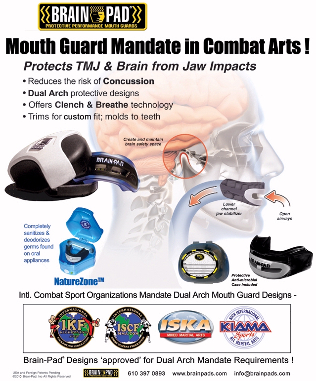 The relationships between Brainpad and the IKF, like Ringside and Combat Sports International goes well beyond the IKF Tournaments. The IKF and other sanctioning bodies ( The ISCF, ISKA and KICK International also made the commitment after the IKF did ) made a commitment last year to begin the implementation of "Dual Arch" technology (A full upper and lower mouthguard for added safety) as a requirement for every fighter on Sanctioned events. Some still would rather use a single guard or a custom dentist made fitted mouthguard and although the IKF and other organizations (Kickboxing, Boxing, MMA) cannot "Force" a fighter to use the dual arch system, the IKF has noticed a significant decrease in head injuries and knockouts of the fighters that do use them. It's been proven that Brainpads Dual Arch Technology has added a higher level of safety for any fighter taking a shot to the head or jaw as compared to a single guard mouthguard. Like Ringside/Combat Sports International, when every fighter leaves the event, they will surly remember Brainpad for their generous gifts to help them in their fighting career. |