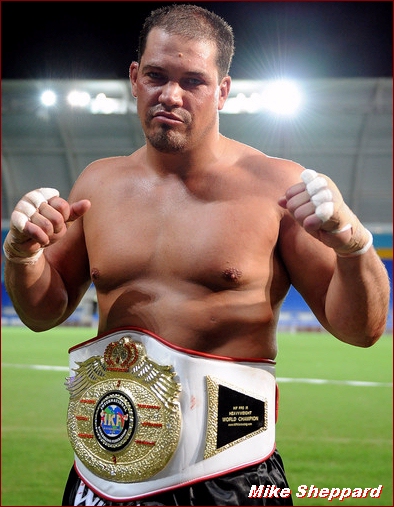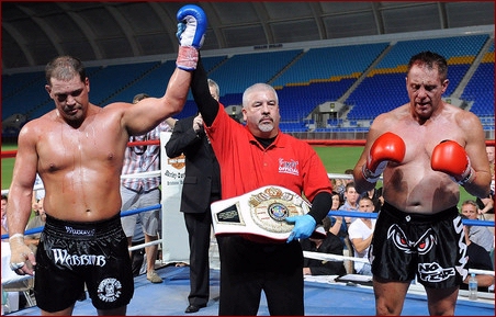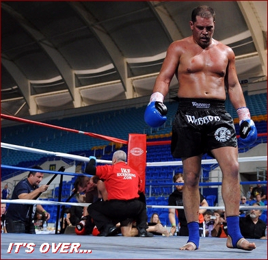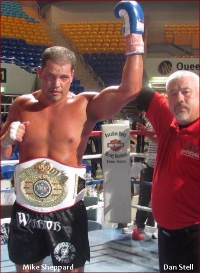 of my ol rugby techniques." Clearly the headbutt was caused when Wilesmith's head leaned into Sheppard, however, days after the bout, Wilesmith had a different memory of the moment when giving an interview to the Australian media. "We clashed heads," Well, to begin with, Wilesmith is right on one account, it did look like he did it intentionally, but the "HE" was Wilesmith, NOT Mike Sheppard. As direct ringside eye witnesses of this bout we were pretty shocked to read this on the internet. Although an uneventful round, as the round came to an end, there was no question as to who won it. If not for the inexperience of one of the "Australian" judges (found later to be selected by Wilesmith) Sheppard would have won round 1 on all 3 judges cards, 10-9. However, the Wilesmith - Australian judges gave round 1 to Wilesmith, despite him only landing a few jabs, and we "Literally" mean a few, as in THREE. As round 2 started, Wilesmith's corner had stopped his head from bleeding so the fight was on again. However, as this round started, Sheppard realized he wasn't afraid of any "Thunderlegs" so he came out strong. Sheppard rocked Wilesmith with body shots and left - right combinations along with several kicks including a good head kick. To his credit, Wielsmith proved one thing, that he had a hard head but even a rock can take a strike, it doesn't express it has "Talent or Skill". As the round was closing out, Sheppard landed some bombs on Wilesmith that rocked him. Instead of covering up as most fighters would to protect themselves, Wilesmith smiled at Sheppard and actually waved him to come again. Wilesmith wanted everyone to "Think" he was having no problem taking Sheppard's blows, yet in reality, it was just the jesters of a fighter who had no answer to his opponent's offense. Saying that Wilesmith weathered Sheppards storm is not a compliment of skill... Having a hard head is not a compliment of skill... However, it's what Wilesmith kept doing which seemed to be the only things keeping him in the fight. As the round came to a close, this time there was no question as all three judges saw this round easily 10-9 for Sheppard. As round 3 started, Sheppard came out with no hesitation scoring punch after punch to Wilesmith's head and body. What many had hoped to be a tremendous fight quickly turned into a one sided frenzy or more so, the bushwhacking nearly everyone in Australia warned the IKF it would be! Sheppard was now landing shot after shot without any real resistance. Wilesmith would continue his only reply which was to smile back at Sheppard as if he wasn't hurt, but at ringside, the message was clear. Wilesmith was in PAIN!" From the corner prior to the 3rd round, Wilesmith was drained. Not only did he not have any answers to Sheppards attack, he had no gas ( endurance ) to even stand up to weather Sheppards shots anymore. Sheppard charged several times as Wilesmith just turned his back to him like a fledgling fighter who was just scared or had never fought in a real bout. It was clear this bout was coming to an end soon. As we past the 1 minute mark in round 3, Sheppard drove the bloodied and battered Wilesmith into his own corner. It was there that Wilesmith would turn his back again to try and escape Sheppard. After World Class Referee and former Champion Kickboxer himself, Dan Stell (Click here to read about Stell's experience) stopped Sheppard from his attack, the two squared up again. A few blows later and Wilesmith was leaning over. Sheppard could have very well landed several telling head shots, but almost as if he felt sorry for him, Sheppard choose to go to the body instead to finish Wilesmith off. Finally Wilesmith went down. Stell started the count, but Wilesmith would not make the count. This long awaited bout was over and Elizabeth, West Virginia, USA's Mike Sheppard would win the IKF World Title by KO at 1:33 of round 3. Sheppard improved to 23-10-1 with 17 wins by stoppage while Wilesmith adds a loss to his record, whatever that record is or was claimed to be. A loss that will likely be his last kickboxing bout. WHAT BOUT WERE YOU WATCHING? "Thunderlegs once again proving why he has that nickname as he destroyed Sheppard's legs." However, we had to ask what fight the writer was watching because Wilesmith's legs were no concern to Sheppard in this fight. Even Wilesmith's corner wondered why he never even turned his hips into any of his kicks. Maybe it was inexperience in the ring or fear of Sheppard countering? Who knows. What we do know is Wilesmith didn't throw "1" strong landing leg kick on Sheppard all night! NOT EVEN ONE! So to say Wilesmith "Destroyed" Sheppards legs comes from the eyes of a blind man. TRYING TO SAVE FACE... There's an article out there on the internet (CLICK HERE) that has some comments such as "but the loss of blood form the head gash and a broken nose took its toll." Bloodloss had NOTHING to do with this bouts outcome!! Sheppard simply beat Wilesmith down with shot after shot from rope to rope, corner to corner. Yes, Wilesmith was bleeding quite a bit, but to say the blood was "Gushing" is an over statement. We've seen a lot worse blood in some elbow cut Muay Thai fights for example. Along with this comment, Wilesmith has made quotes such as, "If it wasn't for the head clash, I reckon I would have won." Well, not sure what bout he was thinking about because after round 2 started, we saw this bout only going one way, Sheppard's! At age 47, Robert Glasson-Wilesmith got his shot. We will say that he "Walked the Walk" when he could have turned away. He took his criticism all the way to the ring. However, with comments like the ones we noted, we can only hope his ego does not overshadow his deserved pride. The only sad thing is how this bout is now being played out in the media with quotes from Wilesmith and writers who interviewed him saying, it was a "Tremendous fight" or an "Out right War" are FAR from the truth. This was no close bout. As we noted a
