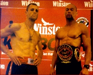 Using different accents in almost every interview, Marinoble was clever, witty, crazy... well lets face it, ever wonder why they call him "The Madman...?" well, we all found out... On the other side of the spotlight was Kimber who still made everyone laugh, but in a more serious tone of humor. The two worked so well together many thought they had known each other for life. However the fact was, they had met for the first time in Los Angeles Airport on Sunday, only a few days before. When asked things like "So, do you think he (Opponent) will be tough competition?" They would respond with lines like, "Well, I hear he dances well..." Or when asked, "Do you think the fight will end early?" One would reply, "Well I don't know about him but I'm packing a lunch because I heard he's pretty tough and I plan on a long nights work." It was lines like these that brought smiles and laughs to those in attendance. Neither cut the other down once. NOT ONCE! In fact, they both had tremendous respect for each other which made them seem like larger than life heroes to not just those in Malaysia, but to the entire IKF Team as well. It was their actions out of the ring that made the stage for one of the Greatest World Title Bouts to come. The day before the weigh-ins, IKF Officials Brooks Mason and Chuck Wolfe went with Andre Thomas to Shah Alam Stadium to help set up the ring and did a great job as well. It was a bran new TWINS Products Ring. Without a doubt, it was the nicest ring we've ever seen around the world. On Friday morning, they went back to finish it up. Later in the day, both fighters were asked if they wanted to go to the arena and get a feel of the ring. While Kimber opted not to, Marinoble took advantage of it. In a stadium that can hold over 10,000, Marinoble checked the ring alone and was dwarfed by the size of the arena. (Right) The event weigh-ins were on Friday night before the scheduled Saturday night bout. Marinoble made sure to grab the spotlight at the weigh-ins when he had trainer Greg Kirkpatrick place a radio inside the conference room where the weigh-ins were to take place. When he was announced to the crowd for his entree, someone pushed the "PLAY" button and Marinoble entered to the tune of "Cowboy" by Kid Rock, struttin in like "The Prince" himself with open shirt and sun glasses. A roar and cheer from the crowd relaxed the press and all who wondered if they should make any noise at all. What else would we expect though from someone known as "The Madman..." Marinoble set the tone as relaxed and what could have been expected to be a tense weigh-in, just turned into another good time for everyone. On the other side of the room, upon being introduced, current Champion Kimber made his entree rather quiet, but professional. With his shirt off showing the Malaysia media what a lot of hard work and 2% body fat looks like. With dozens of cameras flashing and clicking at both fighters, each took their turn at different poses for the media and even shared a few laughs