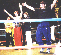 IKF Milwaukee, WI, USA In Milwaukee, America's colosseum of kickboxing, onlookers deem him as "Gladiator." Jason "Gladiator"Johnson (Right in photo) continued his reign of triumph before a sold-out crowd with a stunning win over Kansas City's Jeff "Big Diesel" Ford (L). Both Johnson and Ford have been touted as top American prospects, but tonight Johnson proved to be superior in a dramatic fashion. The first round was punctuated by Johnson landing an impressive head kick, which dropped the ever-formidable Ford. Ford beat the standing eight count and continued to fight back, but Johnson's knee attacks and kicks prevented Ford from establishing a consistent offense. Ford was valiant throughout the bout, but Johnson remained relentless, methodical. The bout was rightfully ended in the third round by referee Al Wichers ; Johnson was landing numerous kicks, punches, and knees on a seemingly unresponsive Ford. Below are the results from the action-packed undercard. Thanks to the sponsors and great fans for making this yet another spectacular "kaboom-kabap" evening of kickboxing! Don't miss Rumble in the Rave II, set for Saturday, March 24, 2001! Be sure to check the IKF News page or www.milwkick.com for more information. |