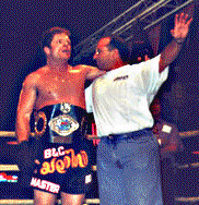 Hayward, Wisconsin February 3, 2000 Now you would think that a fighter with Mike's (L) experience would carefully select a fighter for his retirement fight. You would think that a fighter could be found that would make you look good in front of your home town fans, a fighter that would allow you to get the job done with little effort. But not Mike LaBree! Mike and matchmaker Tom Sullivan go out and pick George Randolph (R). "Big" George Randolph, the top IKF Super Heavyweight contender from Glenville, West Virginia. Any questions on where "Big" George got his nickname were answered at the weigh-in on Friday afternoon. At 6'8" tall, George tipped the scale at a modest 256 pounds. With less than 15% body fat, George looked trim, fit, and just a little bit scary. At 6'4" tall, Labree's official weight was 220.5 pounds. And with Big George sporting a fight record of 56 wins, 6 losses and 1 draw, (Kickboxing only: 18-1/14) Labree's remaining hours before fight time were just a little bit less than relaxing. On Saturday night, however, it was classic LaBree. Both fighters got acquainted in the first round. In that first round LaBree found out just how hard 256 pounds of Big George could punch and kick. LaBree said later that after blocking a Big George round kick, he didn't want to have to do it again! LaBree's determination in the trenches took over in the second round. Referee Rick Bush had to step in and separate the fighters at the end of the round as LaBree didn't want it to end. |