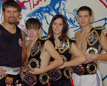 IKF MuayThai Rules Super Middleweight Mexico Champion, Adolfo Lozano (Far right in picture and below) of Puerta Vallarta, Jalisco, Mexico is currently in Thailand doing some intense training. Lozano and his wife Elizabeth will be in Thailand until January visiting several MuayThai camps and getting in some great training. He's hoping his trainingh will come in handy for a possible shot at the IKF North American Title sometime in the spring of 2001. Lozano won his Mexico title back on October 6th in Puerta Vallarta, Jalisco, Mexico. After 4 rounds, his opponent, Enrique Cuellar was well ahead and on his way to the title leading 39-36, 38-36 and 40-38. In the corner, Lozano's trainer asked him to lay on his back so he could lift his legs. However it appeared to many that he had past out instead which prompted the ringside doctor and other officials to come to his corner in preparation to put a stop to the bout. Lozano was told to either sit on his corner stool or stand up or the bout would be stopped. He quickly stood and looked out into the crowd as the chant begin, "Yes You Can, Yes You Can." Over and over again. Down on all the judges cards entering the final round, what happened next can only be called a miricle of will... Lozano came out in round 5 as if he was fighting in round 1. Although noticeably tired, his punches regained some snap and power and his legs were snapping up with speed and power once again. More importantly, the one strike that won him rounds 1 and 2 so easily was back with incredible accuracy, his knee strikes. Over and over again Lozano landed knees on Cuellar who was still strong with his own knees and hands. Then as the 2 came to a clinch, Lozano, out of nowhere, EXPLODED with energy and opened up a non stop attack on Cuellar. Starting with kicks and punches and moving into the clinch, Lozano backed away and let loose with several strong knees that hit Cuellar in the body and finally the ending 2 had direct hits on their target, Cuellar's face. As the 3rd strike ended and Cuellar's head pulled back, blood shot from his nose forcing referee Ubillado Vega to step in. A wise move as it was clear, Lozano was on a roll and had no plans of stopping. Upon closer look, Vego saw the tremendous blood flow from Cuellar's nose and immediately stopped the bout. The ringside doctor later said if Vega didn't stop it, he would of since it seemed to take him a long time to stop the blood flow. At 2:05 of round 4, Lozano had rose up from the strength of his fans and found the energy to win the title against Enrique Cuellar. Lozano later told us that when he stood up during the round 4 and 5 break, he saw his mother and father in the crowd and the look on their faces seemed to motivate him to dig down deep and find the strength to carry on and win. However, as he seemed to look to the heavens and ask if he could do it, almost as if it were planned, his true fans, those who were still there, started chanting back, "Yes You Can", Yes You Can!" And "CAN" he did. It was clearly one of the most memorable moments in IKF Title history to witness such a comeback of a fighter. |
