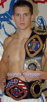 Fight 12 was the fight the majority of the crowd was waiting for. It was time for the "Wonderboy", Stephen Thompson (Left, trained by his father, Ray Thompson and 2001 IKF National Amateur Champion) to do his thing and that was to knock someone out. His opponent was Nicholas Donahue from Augusta, Georgia. Of course Donahue had different thoughts on the subject. The fight started off WIDE OPEN from the bell with Donahue jumping on the "Wonderboy" and putting him on the defensive. After a few exchanges Thompson found his groove and started to work it. With round one in the bag Thompson came out in round two smoking and at about 20 seconds in the round Thompson dropped an axe kick (See Right) on Donahue's head followed up by a straight right that sent the larger Donahue into never, never land. Thompson wins by ko at 20 seconds of the second round. Man what a show and that Wonderboy knows how to put one on!!! RESULTS OF THE OTHER BOUTS